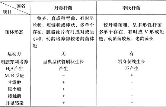 | 释义 | 禽丹毒丝菌感染 禽丹毒丝菌病是由红斑丹毒丝菌(Erysipelothrix rhusiopathiae)引起的多种禽类的一种散在性急性败血症,其特征为全身虚弱,精神沉郁,腹泻和猝死。不同禽类的发病率在1%~50%,死亡率在2.5%~50%不等。本菌还能引起猪丹毒和人的类丹毒。本病不仅能造成死亡,还能使患病母禽产蛋量下降,影响肉品销售质量,造成经济损失。 本菌在无芽孢菌中毒力最强,根据按细胞壁黏肽热稳定抗原划分的红斑丹毒丝菌24个血清型中,禽丹毒红斑丝菌目前有1(分la、lb亚型)、2、5三个血清型。 一、诊检要点 (一)临床表现 火鸡常为散在性,突发性死亡,死亡原因多见增生性心内膜炎。鸡及其他禽类的主要症状是全身虚弱,精神沉郁,产蛋下降,腹泻和猝死。 (二)病理剖检 主要病变:全身性败血症症状,尤以火鸡病变较典型,可见全身性充血;皮肤、浆膜、气囊及实质脏器均有程度不同的出血,常见皮肤普遍变暗或不同大小的暗黑融合性区域;胃溃疡;盲肠有黄色小结节;(跗)关节肿大,关节囊有纤维素性渗出物;肺水肿,肝、脾肿大,易碎,肝中央门沟血管内的纤维蛋白血栓中有本菌体,脾小体鞘动脉透明变性。偶见卡他性出血性肠炎和心脏脂肪淤斑。心肌间质出血,心肌纤维分离(水肿)明显。 (三)流行特点 本病可感染多种禽类,尤以火鸡、鸭、鸽最敏感。鸡常为散发,哺乳动物中猪、绵羊最易感,人也可感染。 该菌宿主广泛,普遍存在于自然界,土壤和腐败物中存活时间最长,并常存在于鱼类和野生动物中,从而造成禽类常用饲料鱼粉的污染,被该菌污染的饲料、饮水、土壤、粪便、用具等,可经消化道感染禽类,也可经皮肤创伤感染或吸血昆虫机械传播。不同禽类的发病率和死亡率差异较大。 (四)实验室检查 1.病原分离培养 病料采集和培养:无菌采取病死鸡肝、脾、心血或骨髓(尤其尸体腐败时,用骨髓培养和制备抹片更合适)。(用病鸡心内膜匀浆接种肉汤,更容易分离到本菌)→涂抹于含5%血清或鲜血的琼脂平板(或含1%葡萄糖和0.5%吐温-80)并调整pH的普通培养基可促进其生长。(当病料被污染时,可加入新霉素100微克/毫升或400微克/毫升卡那霉素或加入0.01%NaN3和结晶紫,以抑制其他革兰氏阴性菌生长且不影响本菌生长,只有本菌才能在此培养基中生长)→5%CO2(传几代后,可在普通大气中生长),37℃培养24~48小时→当以显微镜反射光观察时,在固体培养基上培养24小时后的菌落有光滑(S)型、粗糙(R)型和中间(I)型三种(三个型可发生互相变化)。光滑型(常由急性病例分离得到),菌落圆整光滑,透明,边缘整齐,有亮绿荧光,菌落短而纤细(直径<1毫米)。在鲜血琼脂上生长旺盛,菌落呈大头针帽大小,灰白色,透明、圆形,微隆起,露滴状,呈α型溶血(菌落周围有绿色α溶血环),延长培养时间色变淡;在肉汤中呈均匀轻度浑浊,无菌膜,少量沉淀,振摇时呈云雾状;抹片检查菌体均匀一致细小杆状,毒力很强。粗糙型(常见于经人工培养或从慢性病例、带菌者分离得到)菌落大而厚,菌体粗大呈长链状,表面粗糙,无荧光,边缘不齐,呈土黄(灰)色;在肉汤中菌落呈絮块状或絮丝状生长,明显浑浊,有多量沉淀,振摇时,絮状物浮游起来,经久不散;抹片检查见有多量呈串珠状或有膨大部分的长菌丝,毒力极低。中间型菌落和毒力介于二型之间,呈金黄或橘红色,有弱荧光。 2.病原鉴定 (1)涂片镜检:取病鸡的肝、脾、心血或骨髓→涂片或组织压印片→镜检可见革兰氏阳性念珠状、多型性、无芽孢、无荚膜、无鞭毛、无运动的纤细小杆菌。急性病例组织直接涂片或培养物中,本菌细长,成直或稍弯的杆状单个,短链状、球状或棒状。在培养物中常为细小杆菌。在慢性病例和老龄培养中,本菌呈细长弯曲的菌丝。 (2)生化特性:经人工培养传几代后的典型菌落→三糖铁琼脂或醋酸铅培养基→37℃24小时→变黑(由于产生H2S),明胶穿刺培养呈试管刷状生长,不液化,可作为最佳推断性诊断。 本菌与李氏杆菌主要区别见表7-5。 表7-5 丹毒杆菌与李氏杆菌的鉴别