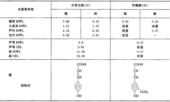 注:MWL——磨木木质素;CEL——酶分离木质素。 从表中可见,自针叶木得到大量的香草醛和少量的对羟苯甲醛,说明针叶木木质素中存在大量的愈创木基和少量的对羟苯基。自阔叶木中得到大量的香草醛和紫丁香醛,以及少量的对羟基苯甲醛,说明阔叶木木质素中存在大量的愈创木基和紫丁香基,以及少量的对羟苯基。从禾本科植物得到大量的对羟基苯甲醛,以及大量的香草醛和紫丁香醛,说明禾本科木质素是由愈创木基、紫丁香基和对羟苯基三种结构单元组成的。 据研究,针叶木硝基苯氧化产生25%左右的香草醛(V)和少量对羟基苯甲醛(H);阔叶木木质素得到40~50%的香草醛和紫丁香醛的混合物;禾草木质素产生20~30%的三种醛的混合物。典型的针叶木木质素S/V接近于零,说明几乎不含紫丁香基结构单元,阔叶木S/V为1~3。而禾本科植物木素中,S/V在0.7~1.4,介于针、阔叶木之间。 5.木质素中的酚酸 禾本科木质素经皂化和温和酸解后的降解产物中含有多种酚酸,主要为对——香豆酸,还有少量阿魏酸等。酚酸的组成及含量与原料种类和木质素分离方法有关。 由表2-9-4的研究结果可见,禾本科木质素中含有较多量的酚酸(主要是酚酸酯),这也是其不同于木材木质素的重要特点。在木材中,除少数树种外,大多不存在酯键。酯键在碱介质中是不稳定的,极易断裂。如小麦草木质素中对—香豆酸含量为2.1~2.8%,其中60%左右形成酯键,竹材中对—香豆酸含量为10%左右,其中80%形成酯键。 表2-9-4 木质素的皂化与酸解产物
