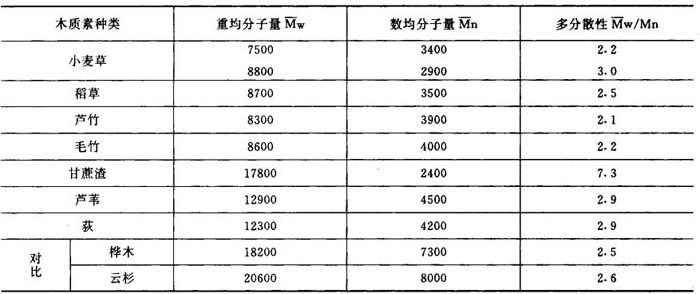 注:MWL——磨木木质素;CEL——酶分离木质素 禾本科中的酚酸结构除对—香豆酸外,还有阿魏酸。阿魏酸主要以醚键与其它木质素结构单元连接,主要形成α-醚键。这种醚键的键能很低,在缓和条件下也可能断裂。 6.木质素的分子量及分子量分布 禾本科木质素的平均分子量及其分布情况列于表2-9-5和表2-9-6中。草类木质素的分子量低,多分散性大,是草类木质素不同于木材的特点。稻麦草、芦竹、毛竹、蔗渣、荻、苇等磨木木质素的重均分子量Mw在7500~12000间,数均分子量Mn在3000~4500,比木材木质素的分子量要小得多。在同样条件下测得的桦木木质素的分子量几乎为禾本科木质素的一倍。而且桦木木质素分子量在1000~10000级分的木质素很少,大大低于禾草木质素。禾本科木质素分子量低,是它在制浆中易溶出的重要原因。 表2-9-5 磨木木质素的分子量与多分散性