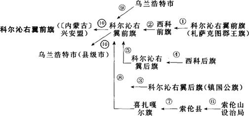 ①1912年称科尔沁右翼前旗,又称扎萨克图郡王旗;1932年7月改称西科前旗。②1948年2月6日西科前旗复称科尔沁右翼前旗。③1912年称科尔沁右翼后旗,又称镇国公旗;1932年7月改称西科后旗。④1949年3月26日西科后旗复称科尔沁右翼后旗。⑤1952年8月12日将科尔沁右翼后旗的额尔格图、察尔森、好仁等3个努图克并入科尔沁右翼前旗。⑥1917年3月15日设索伦山设治局;后改为索伦县。⑦1933年2月1日索伦县改为喜扎嘎尔旗。⑧1948年11月22日喜扎嘎尔旗并入科尔沁右翼前旗。⑨1964年乌兰浩特市并入科尔沁右翼前旗。⑩1980年7月26日科尔沁右翼前旗与乌兰浩特市分设。
