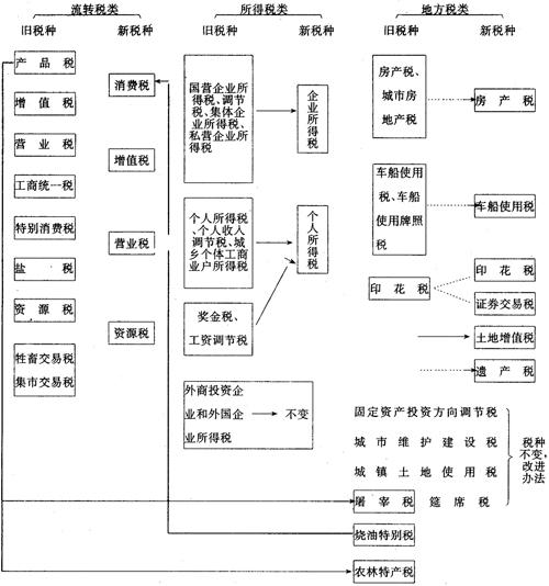 注:①虚线是尚未改革出台的部分。 ②各税类相互间也有收入转移情况,只是不直接、不明显、不易测算,故未标明。 图2-1-1 |