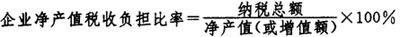 此负担比率最常用、最直接反映了在一定时期内企业收益负担国家税收的状况,它是正确处理国家与企业之间的分配关系的重要依据。 3.企业净产值税收负担比率。 企业净产值税收负担比率是指在一定时期内企业纳税总额与企业净产值或企业增值额的比率。其公式为: