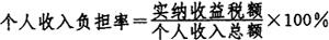 此比率反映了在一定时期内,企业留利中负担国家税收的状况。 5.个人收入负担率。 个人收入负担率是指个人在一定时期内所缴纳收益税额占同期个人收入总额的比率。其公式为: