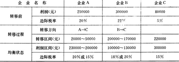 和利润转移前相比,关联企业作为一个整体,税收负担额由104000元减少至84000,绝对额减少20000元。税收负担率由16.5%下降至13.3%,下降3.2个百分点。不过,对各企业来说,税收负担的分布也发生了一定的变化。具体来说,转出利润的企业,税收负担率下降,而接受利润的企业,税收负担率上升。 下面我们再来分析一种其它表现形式的边际均衡状态。比如说,企业B转移170000元利润至企业C,企业A转移50000元利润至企业C,这时, 企业A剩余利润为: 250000-50000=200000元 企业A应纳税额为: 200000×15%=30000元 企业A税收负担率为15%。 企业B剩余利润为: 300000-170000=130000元 企业B应纳税额为: 100000×18%+(130000-100000)×20%=24000元 企业B税收负担率为: