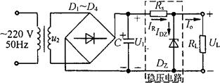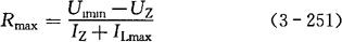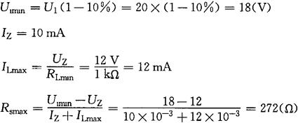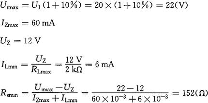 式中 Rmin——限流电阻R的下限值(Ω); U1max——稳压电路最大输入电压(V); UZ——稳压管稳定电压(V); IZmax——稳压管的最大稳定电流(A); ILmin——最小负载电流(A)。 ②限流电阻的上限值