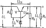 图3-62 简单晶体管串联型稳压电路 简单串联稳压电路的有关计算为: ①调整管参数计算:三极管集电极-发射极间反向击穿电压为 BUCE0=(2~3)(U1max-Uo) (3-253) 式中 BUCE0——三极管集电极-发射极间反向击穿电压(V); U1max——最大输入电压(V); UL——输出电压(V)。 三极管集电极最大允许电流为 ICm=(2~3)Iomax (3-254) 式中 ICm——三极管集电极最大允许电流(A); Iomax——最大负载电流(A)。 三极管集电极最大耗散功率为 PCm≥(U1min-UL)ILmax=UCEminILmax (3-255) 式中 PCm——三极管集电极最大耗散功率(W); U1min——最小输入电压(V); UCEmin——三极管集电极-发射极间最小电压,一般为2~4V。 ②基准电压计算 UZ=UL+UBE (3-256) 式中 UZ——基准电压(V); UL——输出电压(V); UBE——调整管发射结死区电压,锗管为0.2~0.3V,硅管为0.6~0.8V。 ③限流电阻计算