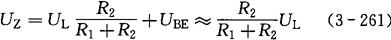 图3-63 带电流负反馈放大电路的稳压电路 带电流负反馈放大电路的稳压电路的有关计算为: ①调整管参数计算:三极管集电极-发射极间反向击穿电压为 BUCE0=(2~3)(U1max-Uo) (3-258) 式中 BUCE0——三极管集电极-发射极间反向击穿电压(V); U1max——最大输入电压(V); UL——输出电压(V)。 三极管集电极最大允许电流为 ICm=(2~3)ILmax (3-259) 式中 ICm——三极管集电极最大允许电流(A); ILmax——最大负载电流(A)。 三极管集电极最大耗散功率为 PCm≥(U1min-UL)Iomax=UCEminIomax (3-260) 式中 PCm——三极管集电极最大耗散功率(W); U1min——最小输入电压(V); UCEmin——三极管集电极-发射极间最小电压,一般为2~4V。 ②基准电压计算