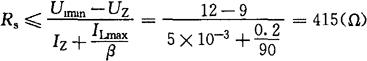 式中 Rs——限流电阻(Ω); IZ——稳压管的稳定电流(A); IZmax——稳压管的最大稳定电流(A); IC1min——三极管V11集电极最小电流,为0.5~2mA; IC1max——三极管V11集电极最大电流,为