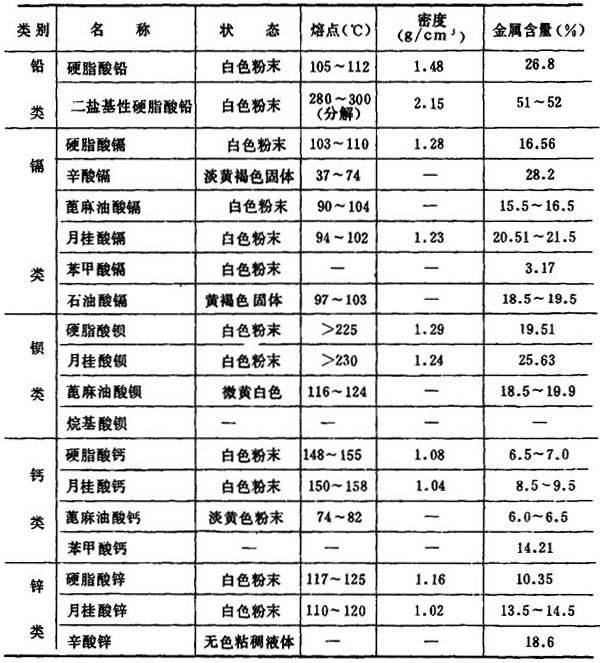 (二)金属皂稳定剂 金属皂类稳定剂是由铅、钡、镉、钙、铝、锂等金属与硬脂酸、月桂酸、蓖麻油酸所生成的皂类。由不同金属离子与酸根所组成的皂类,其性能也不相同。当酸根的结构不同时,皂类稳定剂的: 润滑性 硬脂磷>月桂酸>蓖麻油酸: 相容性 蓖麻油酸>月桂酸>硬脂酸。 主要的金属皂类稳定剂见表2-2-2所示。 表2-2-2 主要金属类稳定剂