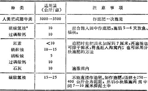 | 释义 | 稻田养鱼管理注意事项 稻田兼作养鱼,在水稻烤田、施化肥、施农药时和养鱼有矛盾,妥善解决这些矛盾是养鱼获得成功的关键。 (1)烤田与养鱼的矛盾 土质肥沃、排水不良、禾苗贪青、分蘖过旺以及病虫害严重的稻田需要烤田。烤田以后可使水稻根系发达,禾苗粗壮,减少病害,控制无效分蘖。烤田时要缓慢排干田面水,适当降低鱼沟鱼窝内的水位,使鱼能在鱼沟鱼窝内活动,最好每天能向沟、窝内注入一些新水,防止缺氧浮头,并适当投喂,保证鱼的生长。烤田时间要短,烤田程度要轻,一般田块中间不陷脚,田边表土不裂缝和以见水稻浮根泛白为度。如果田块需要重烤田,可把鱼临时搬家或加强管理,以做到烤田不烤鱼。另外增加鱼沟鱼窝的面积和深度也是解决水稻烤田时稻鱼矛盾的一条技术措施。 (2)施化肥与养鱼的矛盾 稻田合理施肥,不仅可以促进水稻增产,而且也能促使田内天然饵料的生长和繁殖,为鱼类提供丰富的天然饵料。养鱼稻田应以基肥为主,一次施足,以后看苗追肥。基肥以农家肥为主,既可改善土壤性能,而且一部分有机质还可直接作为鱼的饵料。如用碳酸氢铵作基肥,施肥后7天才能放鱼。追肥使用化肥,但要控制用量和掌握施肥方法,以免过量或方法不当而造成鱼类死亡(表2-112)。 表2-112 稻田养鱼施肥