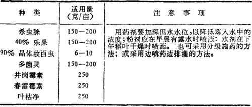 (3)喷撒农药与养鱼的矛盾 稻田养鱼后,鱼能吞食一些水稻害虫,但当稻田害虫虫口密度较大时,仍需喷撒农药灭虫。养鱼稻田中喷撒农药,要求能有效地防治水稻病虫害,又要避免鱼类遭受损失,要选用高效、低毒、低残留、广谱性的农药(表2-113)。 表2-113 养鱼稻田喷药剂量