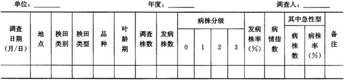 2.2 病情普查 2.2.1 苗瘟普查 从秧苗3~4叶期到移栽大田前3~5天,查1~2次。按病情程度,选择发病轻、中、重的代表类型田,普查田块数不少于20块。以株为单位,每块田随机取30株,调查病株数、急性型病株数、叶龄期。按5.2进行分级。调查结果记入表4-4(注:稻作类型指早稻、中稻、晚稻或一季稻)。 表4-4 秧田叶瘟调查记载表