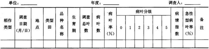 2.1.2 叶瘟调查 从插秧后秧苗返青开始,每5天调查1次,查到始穗期止。根据当地水稻品种的布局状况和生态类型,选择发病条件好、发病较早且有代表性的早、中、迟三类型感病品种稻田各2~3块,作为系统观测田,在整个观察期内不施用防病药剂。每块田于近田埂的第2~3行稻内直线定查二点,每点查2丛稻的绿色叶片。按5.3进行分级,调查结果记入表4-2(注:凡混生急性和慢性病斑的病叶以急性型病叶数计入;剑叶和叶环瘟数应在备注中记载)。 表4-2 大田叶瘟系统调查记载表