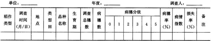 2.1.3 穗瘟调查 从始穗期开始,每5天调查1次,至黄熟期止。以大田叶瘟的系统调查田作为穗瘟的系统调查田。可在原叶瘟定点稻丛内继续观察,病轻年份原定点的稻丛不能明显反映病情趋势时,应从定点处外延扩大到50丛稻进行观察。按5.4进行分级,调查结果记入表4-3。 表4-3 穗瘟系统调查记载表