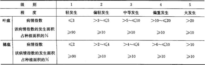4 预测预报方法 4.1 稻叶瘟发生趋势预测 当田间出现发病中心后,如果感病品种的稻苗生长嫩绿,天气预报将有连续阴雨或重雾,温度在20℃以上,隔一周左右,大田将普遍发病,10~14天后病情加重。但稻叶瘟是否流行蔓延,将与病斑型密切相关。如果为急性型病斑,病情会急剧加重,稻叶瘟迅速流行。 4.2 稻穗瘟发生趋势预测 4.2.1 利用气象资料预测 根据温度、湿度(雨日、雨时、雾、露)等因子与稻穗瘟发病的关系,通过多年的资料统计分析,求出不同地区的预测式进行预测。 4.2.2 利用后期稻叶瘟发病率预测 孕穗期稻叶瘟发病率与稻穗瘟损失率的关系比较稳定。可根据抽穗前10天左右调查的植株上部5片叶的平均发病率与稻穗瘟损失率的关系,求出当地稻穗瘟预测式进行预测。 5 预测预报参考资料 5.1 发生程度分级指标 稻瘟病的发生程度以当地发病盛期的平均病情指数及其发生面积占种植面积的百分比例来确定。划分为5级,各级指标见表4-8。 表4-8 稻瘟病发生程度分级指标