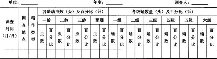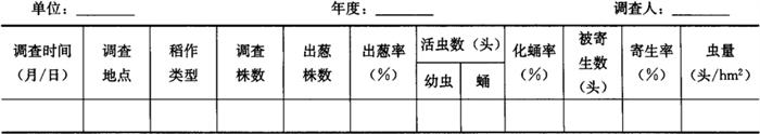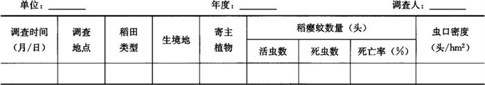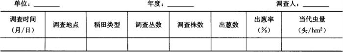 2.6 冬前越冬基数调查 在六代或七代稻瘿蚊出葱结束后至下霜前,选取标葱率高的不同类型稻田,采用平行跳跃五点取样法,抽取5个点,每个点10丛,共查50丛。调查结果记入表4-71,为来年冬后虫源调查选定田块。 表4-71 稻瘿蚊田间冬前越冬基数调查表