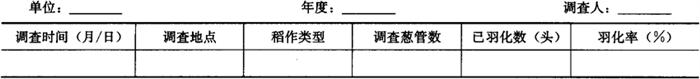 2.4 羽化率调查 对水稻秧田或本田,当田间出现乙型葱管开始,每天调查1次。每次调查100根葱管以上,统计蛹衣挂在羽化孔上的丙型葱管数(已经羽化),并记入表4-69。当羽化率达20%时,为成虫盛发始期,当羽化率达50%时,为成虫盛发高峰期,当羽化率达80%时,为成虫盛发末期。 表4-69 田间稻瘿蚊成虫羽化率调查表