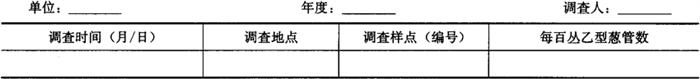 2.5 乙型葱管消长情况调查 从田间开始出现乙型葱管开始,选取有代表性各类型稻田1块。采用对角线五点取样法,选取固定的5个样点并编号,每个点定点调查100丛,逐日或者隔日调查记载乙型葱管数,并将统计完成的葱管拔除。调查数据记载入表4-70。 表4-70 田间稻瘿蚊乙型葱管系统调查表