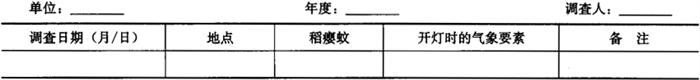 2.7 成虫消长调查 从4月中、下旬至10月上旬。选取远离村民居住地,地势较平坦,有成片水田的稻瘿蚊发生区,安装200W白炽灯或20W的黑光灯(波长3600nm),灯高(灯泡或灯管距地面)1.5m,进行诱测。每天傍晚开灯,次日天亮关灯。将诱集物分日存放,并定期取回,置于室内区别种类,清点虫数。结果记入表4-72。 表4-72 稻瘿蚊灯下稻瘿蚊灯光诱测记载表