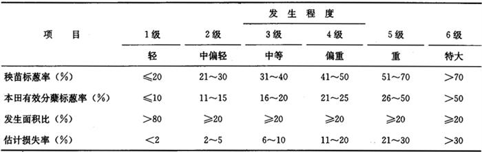 3 预测预报 3.1 长期预报 从气候、虫源、耕作制度、品种布局及天敌寄生等情况,综合分析稻瘿蚊发生的趋势及其为害程度。即结合越冬虫口密度调查、灯诱成虫调查、羽化率或定点乙型葱管消长情况调查以及幼虫、蛹发育进度调查,掌握各代成虫盛发期,结合历史资料,利用上、下世代期距,依据气候变化,耕作制度,品种布局综合分析,预测各代成虫发生期、发生量,各代幼虫为害对象田。 3.2 中期预报 采用历期法依据上一代幼虫、蛹密度和发育进度调查,预测下一代发生期、为害对象田。结合气候条件、耕作制度、品种布局等因子综合预测发生程度。 3.3 短期预报 发布距防治适期10天以内虫情预测。根据灯诱成虫调查、羽化率或定点乙型葱管消长情况调查成虫或幼虫及蛹发育进度调查,采用期距法预测成虫盛发期、卵盛孵期和防治适期,作为指导药剂防治的短期虫情依据。如各代灯诱成虫高峰日加上4~5天(产卵前期1天,卵期3~4天),即为幼虫孵化高峰日;田间成虫羽化率达50%或田间乙型葱管高峰日后的5~7天即为成虫盛发高峰期,或根据幼虫及蛹发育进度,直接推算出成虫盛发期,再加上4~5天即可推算出幼虫孵化高峰期,进而确定防治适期。 4 测报参考资料 4.1 稻瘿蚊蛹分级标准 稻瘿蚊蛹分6级: ◆1级:复眼未现形; ◆2级:复眼粉红色; ◆3级:复眼变鲜红; ◆4级:复眼枣红色; ◆5级:复眼黑褐色; ◆6级:当天羽化。 4.2 稻瘿蚊发生程度分级标准