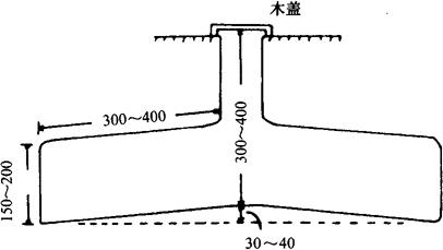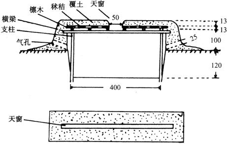 图3-1 北京地区白菜窖示意图(单位:cm) 2.井窖 在地面挖直井筒,在井底再扩大成窖洞的称为井窖。井窖是固定建筑,一次建成后可连续使用多年。窖的窖身在地下,受气温影响较小,因此保温性能很好,适合贮藏生姜、甘薯、柑橘等要求较高温度的产品。北方的井窖以山西井窖为代表,南方的井窖则以四川南充井窖最典型。 山西井窖的做法是:从地面向下挖直径约1m的井筒,深3~4m,再从井底向周围挖一至数个高约1.5m,长3~4m,宽1~2m的窑洞,窑洞口顶成拱形,底面呈水平或10∶1的坡度向内或向外倾斜。井筒口围土做盖,四周挖排水沟;有的在井盖上设置通风口(如图3-2)。
