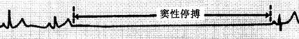图35 窦性心动过缓阿托品试验 (1)静推阿托品前;(2)静推阿托品后 (1)引起窦缓的原因有: ·运动员; ·睡眠时迷走张力提高; ·窦房结病变; ·甲状腺功能减退(甲减)或粘液水肿; ·低温; ·低氧血症; ·急性下壁心梗; ·使用β受体阻滞剂、洋地黄、钙拮抗剂等药物。 (2)症状:轻度窦缓(50~59次/分)病人常无症状,也不需要特殊治疗。明显窦缓(<30~45次/分)者常有低血压、脑供血不足等表现,包括头晕、头痛、黑矇、晕厥。少数病人可伴有血管迷走性晕厥。心梗病人轻度窦缓可降低氧耗量、防止心梗扩展和减少严重心律失常的发生,但明显窦缓对心梗有害。心梗合并窦缓应警惕下壁心梗的发生。 (3)处理:临床医生应嘱病人选择性做阿托品试验、24h动态心电图、平板运动试验、直立倾斜试验、食管或心内心生理检查,以区别病理性和生理性窦缓。有症状者应予治疗,包括阿托品、氨茶碱、山莨菪碱(654-2)片、异丙肾上腺素等药物治疗,必要时植入临时或永久性起搏器。 4.窦性停搏或窦房阻滞(sinus arrest or sinoatrial block) 窦性停搏是由于窦房结功能一过性障碍,导致心动过缓和(或)停搏引起的。窦房阻滞是指窦房结发出的激动在向心房传导过程中被阻断,导致类似于窦性停搏的心动过缓和(或)停搏(图36、37)。