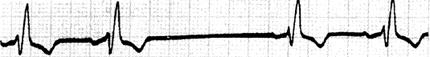 图37 窦房阻滞 (1)心电图表现:窦性停搏的心电图中,长P-P间距与短P-P间距之间无整倍数关系,而窦房阻滞时两者有整倍数关系(图38)。