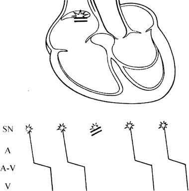 图28 窦房结 窦性心律不齐(sinus irregularity)的P-P间期差,在同一导联>0.12s,常与窦缓并存。多见于青少年和自主神经功能紊乱者,且常与呼吸周期有关,无临床意义。也有的窦性心律不齐与呼吸无关,如窦房结内游走性心律不齐(图29)。