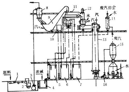 图6-3-4 10t/d立管式连续蒸煮流程 1-胶带运输机 2-转子计量计 3-风送机 4-浓碱槽 5-浓碱箱 6-稀碱箱 7-热水箱 8-旋风分离器 9-浸渍机 10-碱液位箱 11-螺旋压榨机 12-立式螺旋推进器 13-立式连续蒸煮器 14-混合冷凝器 15-喷放锅 16-排料阀 (3)设备技术特征 ①胶带输送机:胶带宽500mm,鼓轮中心距10m,线速11m/min,电动机1.7kW,减速机PM250-Ⅰ-IU。 ②调量器:双辊钉齿式,辊子规格Φ350×640mm,双辊中心距336mm,辊子转速2~6r/min。电机JZS-51,3/1kW,470-1410r/min。ZYS型4.4kW,1900Z/F,减速箱PM250-Ⅰ-2U。 ③风机:进口Φ408m,出口Φ400×400mm,叶轮Φ750×340mm,电机20kW。 ④旋风分离器:圆筒部Φ1000×1300mm,锥体高50mm,入料口Φ300mm,放料口500×300mm,排气口Φ520mm。 ⑤浸渍机为链条耙齿式,浸渍槽宽600mm,长6700mm,倾斜40°,链条速度3.1m/min,进料口640×940mm,出料口500×731mm,电机2.8kW,减速箱PM350-Ⅰ-2U。 ⑥螺旋压榨机:螺旋Φ387mm,6节半,螺距300,240,190,190,190,190,95mm,螺旋转速12.5r/min,筛鼓孔径Φ2.5~3mm(部分Φ4~5mm),电机10kW,蜗杆蜗轮减速箱,速比53∶2。 ⑦立管螺旋输送器:螺旋前4节Φ280mm,螺距200mm,后半节螺旋Φ280mm递减至Φ150mm,螺旋转速31r/min。输送管Φ340mm,加防滑筋条后有效内径为Φ320mm。电机JTC562、1.6kW、31r/min。 ⑧格仓进料器:转子规格Φ439/Φ420×382mm,锥度1∶20。格仓共7格,每格容积2500n1,转速13.5r/min,进料口268×220mm,出料口268×180mm,工作压力392~588kPa,(4~6kg/cm2),电机2.8kW,减速机PM250-Ⅲ-IU。 ⑨蒸煮横管:内径Φ350mm有效长2800mm,管壁厚10mm。螺旋Φ310mm,螺距210mm,转速22r/min,进料口Φ350mm,电机2.8kW,减速机PM250-Ⅲ-IU。 ⑩蒸煮立管:内径上端Φ600mm,下端Φ900mm,管壁厚10mm,长度9000mm。总容积4m3,有效容积3.5m3,工作压力392~784kPa(4~8kg/cm2),水压试验1176kPa(12kg/cm2)。 进料口Φ350mm,出料口Φ150mm2个。 搅拌器,4片桨叶式,Φ850mm,转速8r/min。电动机2.8kW,减速机PM350-Ⅰ-IU。 ⑾弯管排料器:进口管径Φ150mm,出口径Φ127mm,阀口Φ80mm,排料速度11~37次/min,电机JZS51,3/1kW,470~1410r/min和电机ZYS型4.4kW,1900Z/F。 ⑿喷放锅:有效容积3m3,进料口Φ80mm,出料口Φ130mm,推进器螺旋桨式Φ300mm,转速330r/min。电动机1.7kW。 2.ZJL11型立锅式连续蒸煮器 主要适用草类原料制浆,生产能力草浆20t/d,蔗渣浆25t/d,最大蒸汽压力392kPa(4kg/cm2)。 (1)活底料仓 尺寸7000×3600×4000mm,有效容积60m3,链板线速0.07~0.35m/min,重量4800kg。电机JZT51-4,7.5kW,1200~120r/min2台,减速机速比170.181台,PM250-Ⅸ-12,速比8.231台。 (2)预浸渍管 Φ900×7000mm,有效容积3.3m3,螺旋转速2~10r/min,草料在管内停留时间1.35~6.75min。 配用电机JZT52-4,10kW,1250~250r/min,拖动电机JO2-52-4T2,10kW。减速电机PM500-Ⅲ-2Z。 (3)格仓加料器 转子规格Φ650/Φ595×550mm,转速8~24r/min,进料口250×400mm,出料口Φ450mm,电机JZT51-4,7.5kW,1250/250r/min,拖动电机10kW。 (4)预蒸管(又称卧式螺旋蒸煮管) Φ600×5000mm,螺旋Φ550mm,转速1.7~17.1r/min,进料出料口为Φ460mm。 电机JZT42-4,5.5kW,1200/120r/min,拖动电机JO242-4T25.5kW。 (5)立式蒸煮锅 有效容积15m3,蒸煮区Φ1400×8500mm,黑液提取区Φ1500×2000mm,最高工作压力392kPa(4kg/cm2),搅拌器转速7.2r/min,电机7.5kW,960r/min。 (6)连续排料器