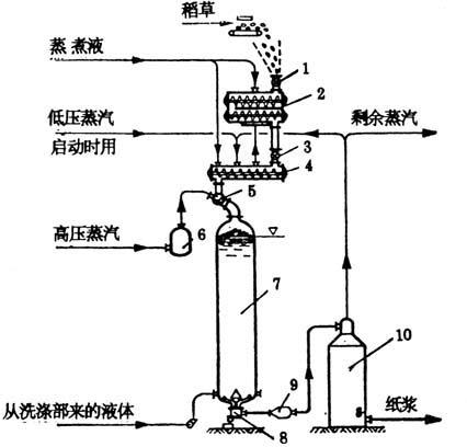 图6-3-6 草类连续蒸煮器 1-转子进料器 2-预浸渍器 3-低压进料器 4-低压浸渍器 5-高压进料器 6-蓄冷罐 7-蒸煮器 8-排料装置 9-网式浓缩器 10-喷放锅