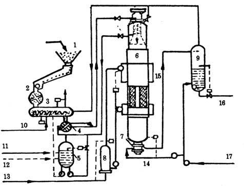 图6-3-7 卡米尔式连续蒸煮器 1-木片库 2-机械给料器 3-汽蒸管 4-碱液和木片的给料器 5-白液与黑液的聚集槽 6-蒸煮锅 7-放锅器 8-碱液循环装置加热器 9-放锅槽 10-蒸锅松节油的低压蒸汽 11-白液 12-黑液 13-压力为0.12MPa的蒸汽 14-在压力0.11~0.12MPa下的黑液 15-纸浆 16-送洗浆车间 17-稀释用黑液 |