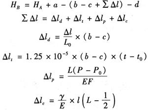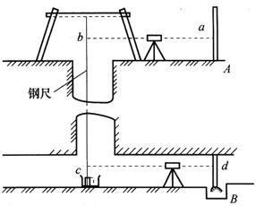 图12-13 竖井高程传递(一) 首先将经检定的长钢尺悬挂在竖井内,钢尺零端朝下,下端挂重锤,并置于油桶里,使之稳定。在井上、井下各安置一台水准仪,精平后同时读取钢尺上读数b、c,然后再读取井上、井下水准尺读数a、d,测量时用温度计量井上和井下的温度。由此可求取井下水准点B的高程HB为: