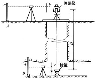 式中 HA——地面近井水准点的已知高程; △ld——尺长改正数; △lt——温度改正数; △lp——拉力改正数; △lc——重力改正数; △l——钢尺经检定后的一整尺的尺长改正数; L0——钢尺名义长度; t——井上、井下温度平均值,t0为检定时温度(一般为20℃); γ——钢的单位体积重量,即7.8g/cm3; E——钢的弹性系数,等于2×106kg/cm2; F——钢尺的横断面积; l——l=(b-c)。 注意:如果悬挂是钢丝,则(b-c)值应在地面上设置的比长器上求取;同时,地下洞内一般宜埋设2~3个水准点,并应埋在便于保存、不受干扰的位置;地面上应通过2~3个水准点将高程传递到地下洞内,传递时应用不同仪器高,求得地下洞内同一水准点高程互差不超过5mm。 2.光电测距仪与水准仪联合测量法 当竖井较深或其他原因不便悬挂钢尺(或钢丝),可用光电测距仪代替钢尺的办法,既方便又准确地将地面高程传递到井下洞内。当竖井深度超过50m以上时,尤其显示出此方法的优越性。 如图12-14所示,在地上井架内架中心上安置精密光电测距仪,装配一托架,使仪器照准头直接瞄准井底的棱镜,测出井深D,然后在井上、井下分别同使用1台水准仪,测定井上水准点A与测距仪照准头中心的高差(a-b),以及井下水准点B于棱镜面中心的高差(c-d)。由此可得井下水准点B的高程HB为 HB=HA+a-b-D+c-d 式中 HA——地面井上水准点已知高程; a、b——井上水准仪瞄准水准尺上的读数; c、d——井上水准仪瞄准水准尺上的读数; D——井深(由光电测距仪直接测得)。 注意:水准仪读取b、c读数时,由于b、c值很小,也可用钢卷尺竖立代替水准尺。本法也可以用激光干涉仪(采用衍射光栅测量)来确定地上至地下垂距D。这些都可以作为高精度传递高程的有效手段。