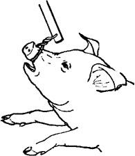 图5.1.1 鼻勒保定法 2.鼻捻棒保定法 鼻捻棒的把柄长1~2m,绳圈适当大一点,绳质略硬,套嘴比较方便。保定时,以绳圈套住猪的上颌,用力拧紧即可(图5.1.2)。此法用于保定公猪效果较好,即使是非常凶猛的公猪一旦被拧上鼻捻棒,也可安静接受针治。