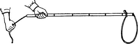 图5.1.2 鼻捻棒保定法 鼻捻棒也可以用一根1.5~2m长的竹竿和一根2~4m长的绳制成。将竹竿内节打通,绳的一端固定在竹竿的一端,为近猪端;另一端穿过空心竹竿,为手执端。保定时将近猪端的绳圈放大,一手握竹竿,另一手握住手执端,套住猪嘴后,抽紧手执的绳头,并转动竹竿用力拧紧(图5.1.3)。