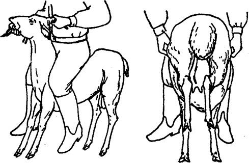 对羊臀股部施针术时,可采用倒骑保定法。即保定者面向羊尾,倒骑在羊背上,两手提握两侧膝皱皮肤,并提起后躯,两腿紧夹其胸腹侧(图6.1.2)。