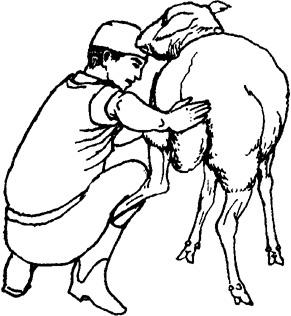 1.骑跨保定 保定者骑在羊背部,两腿膝部用力夹住羊的两侧胸壁,两手握紧两个羊角,或一手握角(耳),另一手握羊的下颌。如将羊的股部抵在墙角,则保定更加牢固(图6.1.1)。