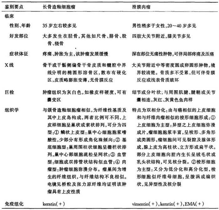 | 释义 | 第六节 上皮或上皮样肿瘤的鉴别诊断 长骨造轴细胞瘤与滑膜肉瘤的鉴别:长骨造釉细胞瘤为一罕见的骨原发性低度恶性肿瘤,形态上与颌骨造釉细胞瘤相似,为骨内特有的上皮样肿瘤,大多发生在胫骨,典型病变为纤维性基质及其中上皮岛构成,上皮样细胞呈巢状或索状排列,其间为增生的纤维组织。滑膜肉瘤是多发生在大关节附近软组织的恶性肿瘤,可侵及骨,滑膜肉瘤的上皮成分多为腺样结构,而造釉细胞瘤上皮成分多为实体细胞巢(表13-18)。 表13-18 长骨造釉细胞瘤与滑膜肉瘤的鉴别要点