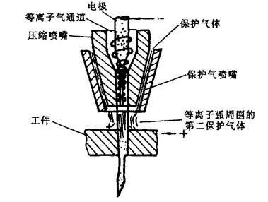 | 释义 | 等离子弧切割方法 (1)双气流等离子弧切割 图5-17示双气流等离子弧切割方法的原理,在等离子弧周围通有第二路气,中间的离子气通常为氮气,外圈的第二路气根据切割工件材料选用,可以是CO2、空气、氩气或氢气,第二路气可以使等离子弧进一步压缩,提高能量密度,切割碳钢时,第二路气可选用压缩空气以提高切割速度.