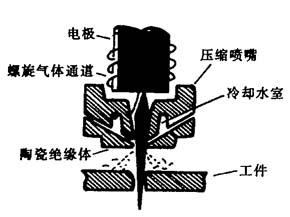 图5-17 双气流等离子弧切割原理 (2)水压缩等离子弧切割 图5-18示出水压缩等离子弧切割方法的原理,高压水从枪体径向通入,由喷嘴孔道喷出,与等离子弧直接接触.一方面强烈压缩等离子唬使其能量密度提高;另一方面由于等离子弧的高温而分解成氢和氧,构成切割气体的一部分,分解成的氧气对切割碳钢更有利,增加了碳钢的燃烧,高速水流除冲刷切割作用外,对工件还有强烈冷却作用,割口倾斜角度校割口质量好,这种方法应用于水中切割工件时,可以大大降低切割噪声、烟气和烟尘,枪体下部可用陶瓷加工,减少双弧危险.