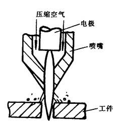 图5-18 水压缩等离子弧切割原理 (3)空气等离子弧切割 图5-19示出空气等离子弧切割原理,此法摒弃了传统的惰性气体作离子气,采用取之不尽的空气经压缩后直接通入喷嘴,经电弧加热后分解出氧,未分解的空气以高速冲刷割口.分解出的氧与工件产生强烈反应,特别适宜于切割黑色金属,但是空气对高温状态的钨会产生氧化反应,为此,采用锆、铪或其合金作为电极.为了提高电极工作寿命,电极一般制成直接水冷的镶嵌式形状,小电流切割时,也可不用水冷. (4)水下等离子弧切割 为了在海底工程施工中解决大厚度不锈钢等切割问题,国内外都已在水下5~10m淡水或海水中试验了等离子弧切割,目前已能成功地切割100mm以下不锈钢或其他材料. (5)脉冲等离子弧切割 用50~100Hz脉冲等离子弧切割可以降低所需功率,延长电极和喷嘴寿命,提高切口质量. (6)双弧切割 在非转移普通直流等离子弧的基础上,再在喷嘴与工件之间叠加一个350Hz交流电弧的双弧切割法,是一种厚板切割的可行方法. (7)微束等离子弧切割 切割0.1~0.5mm薄板,可采用功率0.5~1.5kW,喷嘴孔径0.1~0.4mm的非转移微束等离子唬最高切割速度可达10m/min.
