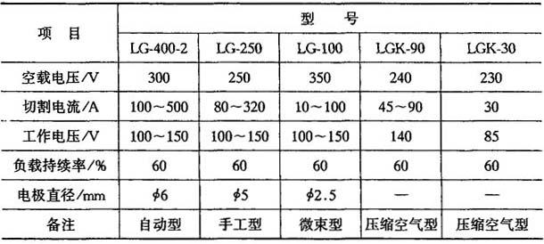 (1)切割电源 大多数切割工作都采用转移唬电源都选用陡降或垂降外特性,比等离子弧焊电源空载电压高,国产切割电源的空载电压都在200V以上,水压缩等离子弧切割电源的空载电压为400V,表5-8列出国产等离子弧切割机的型号及技术数据.