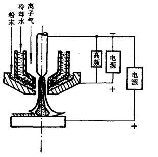| 释义 | 等离子弧喷焊原理 等离子弧喷焊原理如图5-39所示,一般采用两台整流电源,将负极并联在一起,通过电缆接至喷枪的电极,其中一台电源的正极接喷枪的喷嘴,用于产生非转移唬另一台电源的正极接工件,用于产生转移唬冷却水通过水电缆引入喷枪,冷却喷嘴和电极,采用氩气作离子气,引入喷枪,电源接通后,借助高频火花引燃非转移唬继而利用非转移弧射流在电极与工件间造成的导电通道,引燃转移唬在建立转移弧的同时或之前,由送粉器向喷枪供给合金粉末,吹入电弧中,并喷射到工件上,因而转移弧一建立,就在工件上形成合金熔池,使合金粉末在工件上熔融,随着喷枪和工件的相对移动,液态合金逐渐凝固,便形成合金喷焊层(亦称熔敷层).