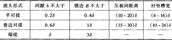 图6-13 厚度小于0.8mm的常用接头形式 (a)对接 (b)卷边 (c)端接接头 1-压板 2-垫板 表6-2 厚度δ<0.8mm的接头装配要求