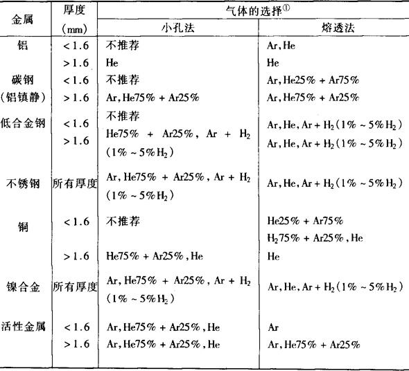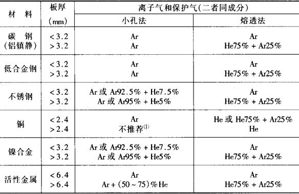 注:①由于底部焊道成形不良,这种技术只能用于铜锌合金的焊接。 表6-4 小电流等离子弧焊用保护气