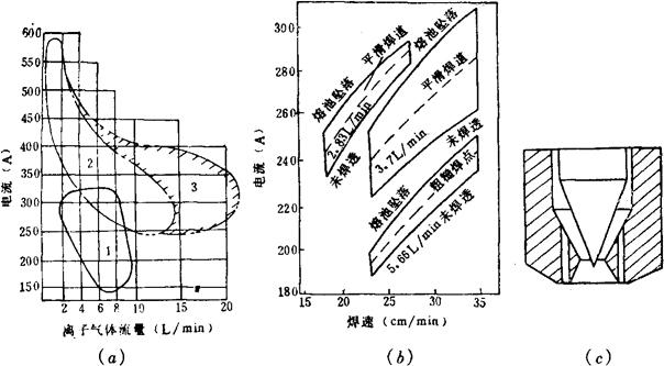 图6-15 小孔型等离子弧焊工艺参数匹配 (a)焊接电流-离子气流量匹配 (b)焊接电流-焊接速度-离子气流量匹配 (c)电极在收敛扩散型喷嘴中的相对位置 3.小孔型等离子弧焊参考规范见表6-5。 表6-5 小孔型等离子弧焊规范参数