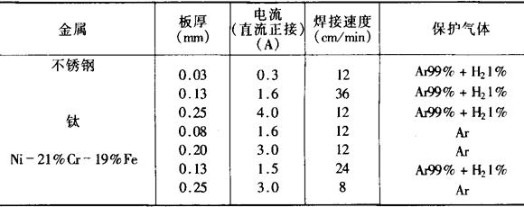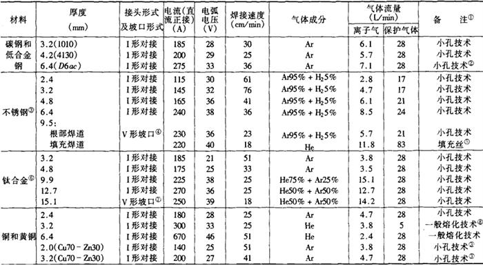 注:①碳钢和低合金钢焊接时喷嘴高度为1.2mm;焊接其他金属时为4.8mm;采用多孔喷嘴。②预热到316℃;焊后加热至399℃;保温1h。③焊缝背面须用保护气体保护。④60°V形坡口,钝边高度4.8mm。⑤直径1.1mm的填充金属丝,送丝速度152cm/min。⑥要求采用保护焊缝背面的气体保护装置和带后拖的气体保护装置。⑦30°V形坡口,钝边高度9.5mm。⑧采用一般常用的熔化技术和石墨支撑衬垫。 4.熔透型及微束等离子弧焊工艺 工艺参数与小孔型相类似,对于中、小电流熔透型等离子弧焊宜采用联合型弧。联合型等离子弧,由于维弧——非转移弧的存在,使转移弧易于稳定。甚至1A以下仍能稳定燃烧。非转移弧(维弧)电流不宜过大,以免损坏喷嘴, 1-圆柱型喷嘴 2-三孔型收敛扩散型喷嘴 3-加填充金属可消除咬肉的区域一般2~5A为宜。熔透型及微束等离子弧焊工艺参数见表6-6、表6-7。 表6-6 熔透型等离子弧焊工艺参数参考值