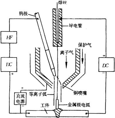 图6-10 钨极式熔化极等离子弧焊 5.热丝等离子弧焊 为提高熔敷速度,用一单独的平特性交流电源加热填充焊丝,交流电源可以减弱磁偏吹,对稳定电弧有利。为提高生产率可以采用双丝和多丝输送。图6-11是双丝热丝等离子弧焊的示意图,这种方法适用于堆焊。