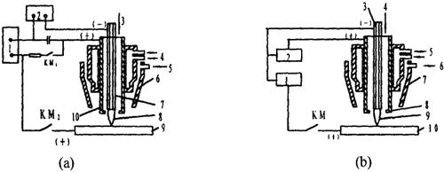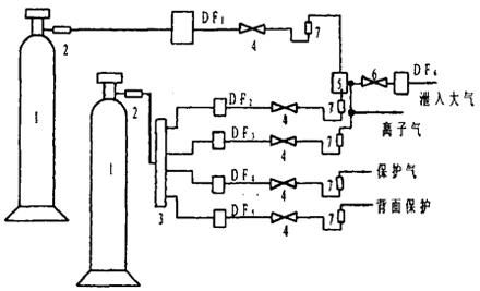 图1-7-2 典型等离子弧焊接设备的组成图[3] (a)强流等离子弧焊接系统示意图 1.焊接电源 2.高频振荡器 3.离子气 4.冷却水 5.保护气 6.保护气罩 7.钨极 8.等离子弧 9.工件 10.喷嘴 KM1、KM2.接触器触头 (b)微束等离子弧焊接系统示意图 1.焊接电源 2.维弧电源 3.钨极 4.离子气 5.冷却水 6.保护气 7.喷嘴 8.保护气罩 9.等离子弧 10.工件 KM.接触器触头 1.弧焊电源 等离子弧焊接设备一般采用具有垂直外特性或陡降外特性的电源,以防止焊接电流因弧长的变化而变化,获得均匀稳定的熔深及焊缝外形尺寸。一般不采用交流电源,只采用直流电源,并采用正极性接法。与钨极氩弧焊相比,等离子焊所需的电源空载电压较高。 采用氩气做等离子气时,电源空载电压应为60~85V;当采用Ar+H2或氩与其他双原子的混合气体做等离子气时,电源的空载电压应为110~120V。采用联合型电弧焊接时,由于转移弧与非转移弧同时存在,因此,需要两套独立的电源供电。利用转移型电弧焊接时,可以采用一套电源,也可以采用两套电源。 一般采用高频震荡器引弧,当使用混合气体做等离子气时,应先利用纯氩引弧,然后再将等离子气转变为混合气体,这样可降低对电源的空载电压要求。 2.控制系统 控制系统的作用是控制焊接设备的各个部分按照预定的程序进入、退出工作状态。整个设备的控制电路通常由衰减控制电路、焊接小车或专用工装控制电路以及程控电路等组成。程控电路控制等离子气预通时间、等离子气流递增时间、保护气预通时间、高频引弧及电弧转移、电流衰减熄弧、延迟停气等。 3.供气系统 等离子弧焊接设备的气路系统较复杂。由等离子气路、正面保护气路及反面保护气路等组成,而等离子气路还必须能够进行衰减控制。为此,等离子气路一般采用两路供给,其中一路可经气阀放空,以实现等离子气的衰减控制。采用氩气与氢气的混合气体做等离子气时,气路中最好设有专门的引弧气路,以降低对电源空载电压的要求。图1-7-3为采用混合气体做等离子气时等离子弧焊接的气路系统图。引弧时,打开气阀DF2,向等离子弧发生器中通以纯氩气,电弧引燃后,再打开电磁气阀DF1,使氢气也进入贮气筒中,此时等离子气为Ar+H2,通过针阀6及电磁气阀DF6可实现等离子气衰减。当焊接终了时,DF6打开,等离子气路中的气体经过针阀6及DF6部分向大气中排放,通过调节针阀b可调节衰减速度。