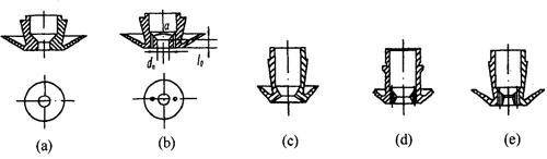 图1-7-4 等离子弧焊接喷嘴的形状[4] (a)圆柱单孔型 (b)圆柱三孔型 (c)收敛扩散单孔型 (d)收敛扩散三孔型 (e)带压缩段的收敛扩散三孔型最重要的喷嘴形状参数为喷嘴孔径及喷嘴孔道长度。 ①喷嘴孔径dn dn决定了等离子弧的直径及能量密度,如图1-7-5所示。通常应根据焊接电流大小及等离子气种类及流量来选择。直径越小,对电弧的压缩作用越大,但太小时,等离子弧的稳定性下降,甚至导致双弧现象,烧坏喷嘴。表1-7-1列出了不同直径喷嘴的许用电流。